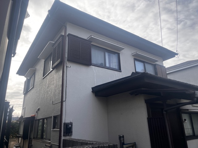 見えない部分こそ丁寧に。高圧洗浄・亀裂補修から始める高品質塗装 工事場所 群馬県 高崎市 工事内容 外壁塗装 工事期間 14日間 材料 Share 【施工前】 施工前になります。 施工前になります。 【施工中】 まずは長年蓄積した苔やカビ、古い塗膜を高圧洗浄で徹底的に洗い落とします。この「洗う」工程を疎かにすると、どんなに良い塗料を塗ってもすぐに剥がれてしまいます。隅々まで入念に洗浄し、塗装に最適な状態を作ります。 洗浄後に見つかった外壁のひび割れ(クラック)を、専用の補修材でVカット・シーリング処理し、強固に補修します。雨水の侵入経路を完全に断ち切る、非常に重要な工程です。 破風板塗装になります。 アレスダイナミックMUKIマイルド」下塗り1回・上塗りを2回行い、仕上げます。以前の汚れやひび割れが嘘のように、美しく、そして強靭な外壁に生まれ変わります。 破風板塗装上塗りになります。 軒天 3部艶のセラmシリコンになります。 軒天上塗りになります。 外壁塗装ダイナミックTOPムキマイルドになります。 【施工後】 施工完了になります。 施工完了になります。